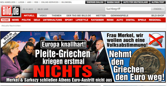 Δεν είναι μόνο η Άνγκελα Μέρκελ, ο Νικολά Σαρκοζί, η Κριστίν Λαγκάρντ και πολλοί άλλοι που οργίστηκαν από την απόφαση Παπανδρέου να οδηγήσει την Ελλάδα σε δημοψήφισμα.Είναι χαρακτηριστικό το σημερινό πρωτοσέλιδο της Bild, της μεγαλύτερης σε κυκλοφορία γερμανικής εφημερίδας, που ζητά να εκδιωχθεί η Ελλάδα από την ευρωζώνη. Και ζητά να γίνει με... δημοψήφισμα!